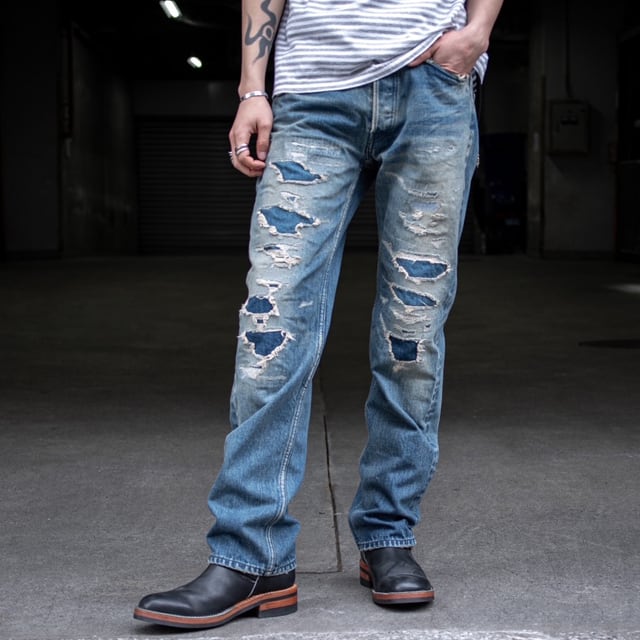 途方もない年月穿き続けたような色落ちやダメージを製品加工で表現。